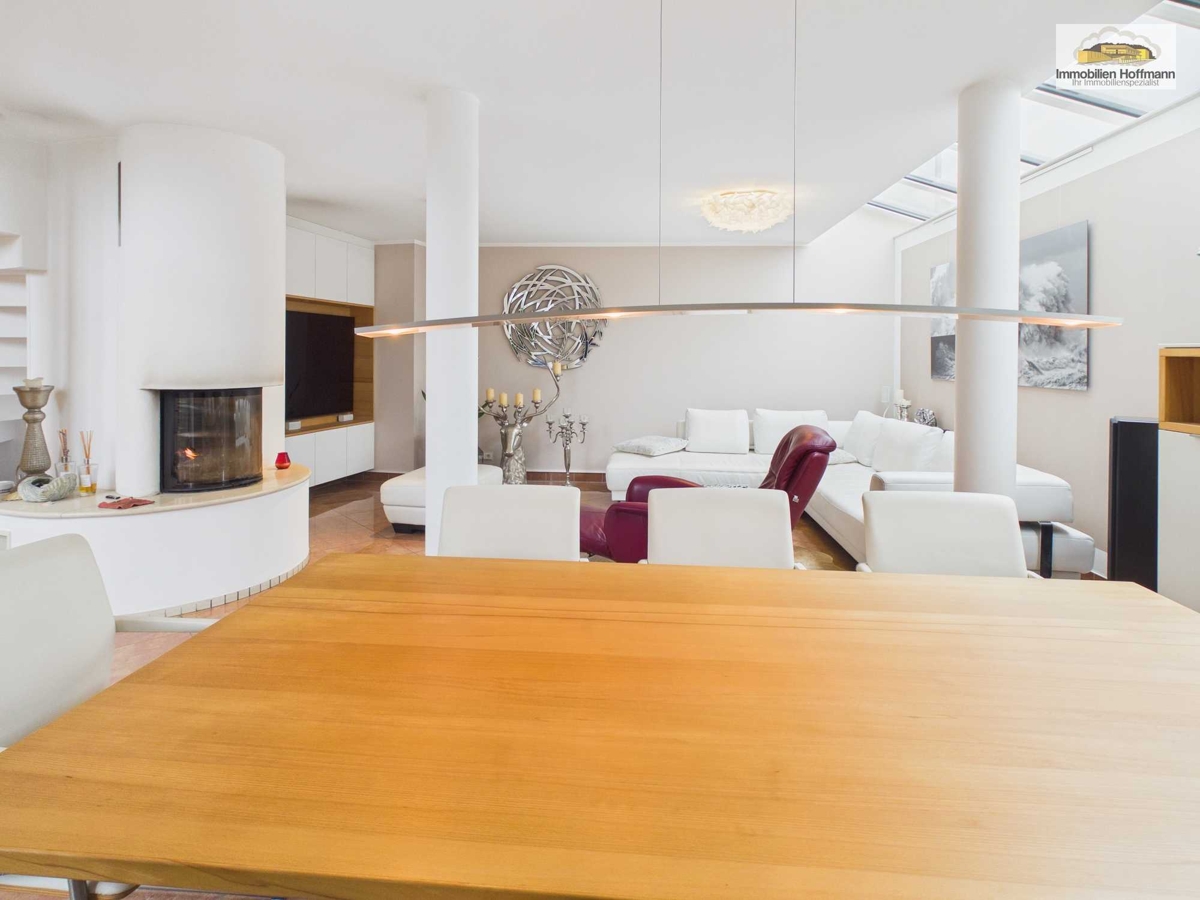 Das Obergeschoss mit ca. 173 m² ist als großzügige Maisonette gestaltet und vermittelt nahezu Einfamilienhaus-Charakter. Offene Raumstrukturen, hohe Decken und große Fensterflächen sorgen für Helligkeit und Weite. Der Holzofen mit Außenkamin bildet das atmosphärische Zentrum des Wohnbereichs.